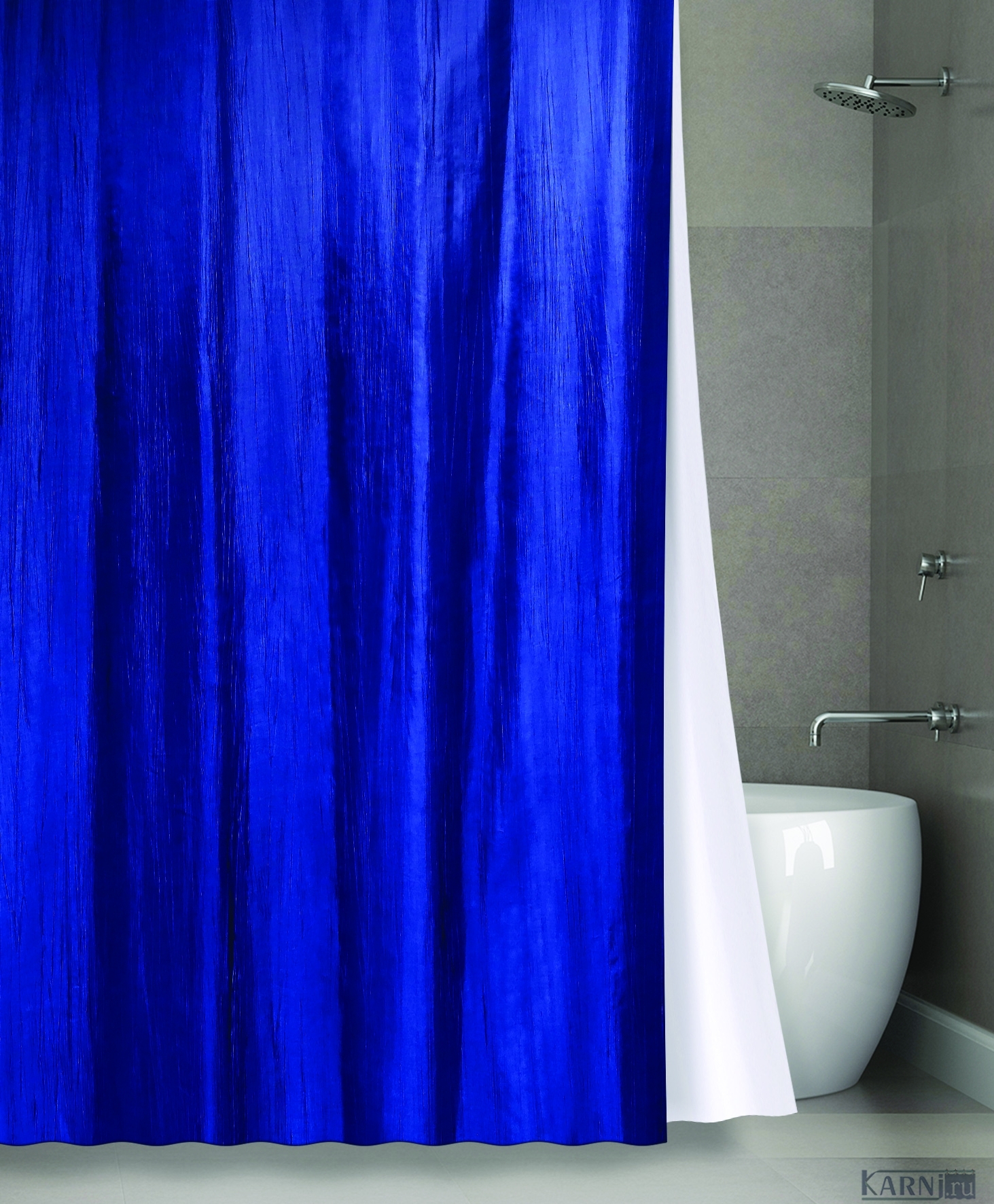 Двухслойная штора для ванны с 12 металлическими люверсами под кольца. Снаружи цветная штора из органзы, внутренняя штора - клеенка ПВХ для защиты от влаги. Цвет: сама штора темно-синяя/клеенка белая полупрозрачная.